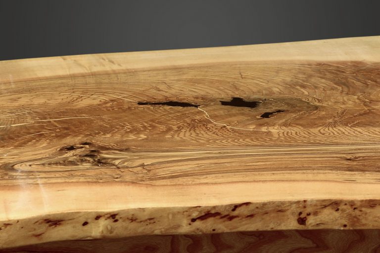 Aufgrund seiner Beschaffenheit war es schwierig zu verarbeiten und wäre im Rahmen industrieller Fertigung als minderwertig aussortiert worden. Aber mit unserer jahrenlangen Erfahrung und geschickter Verarbeitung konnten wir daraus einen Esstisch fertigen, dessen Rechteckigkeit durch organisch-individuelle Charakterzüge zu einem einzigartigen Mittelpunkt eines Essbereichs werden konnte.
